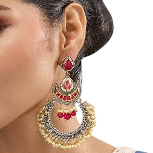 Oxidised Silver-Plated Pearl & Kundan Chandbali Earrings for Women