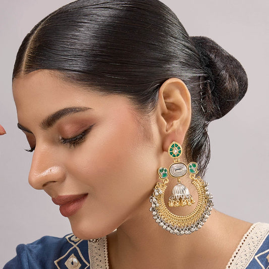 Traditional Gold & Silver-Plated Chandbali Earrings with Green Enamel & Jhumka Drop for Women