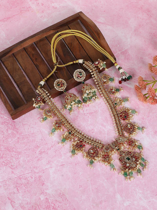 Gold-Plated Artificial Stone-Studded & Beaded Peacock-Inspired Jewellery Set