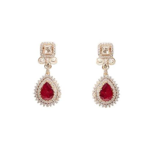 Ruby Red Drop Earrings – Pear-Cut Stone with Kundan Halo