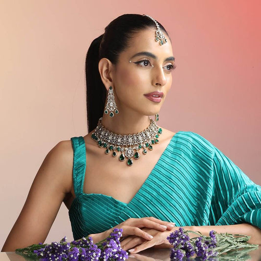 Stunning Emerald Drop Kundan Choker Set with Maangtikka – Royal Green and Pearl Combination