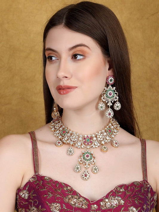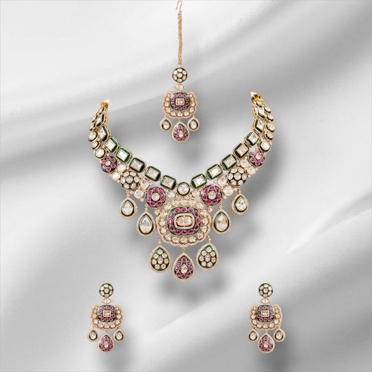 Gorgeous Bridal Necklace and Earrings Set with Ruby, Green, and Pearl Stone