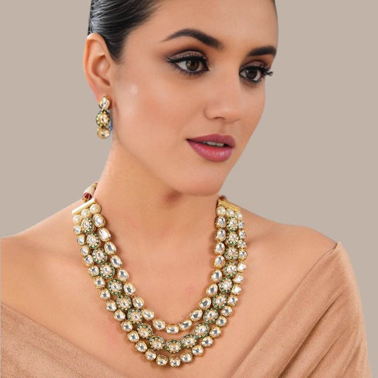 Grand Multi-Layered Kundan Pearl Bridal Necklace Set Earrings