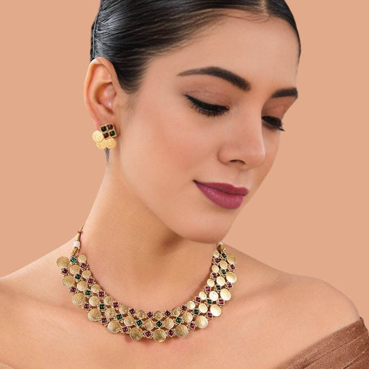 Antique Gold Floral Kundan Choker Necklace Set with Stud Earrings