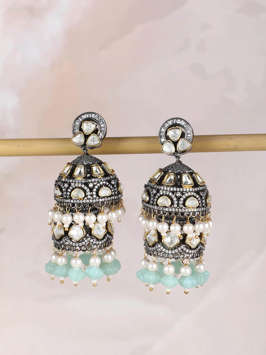 Exquisite Moissanite Silver-Plated Jhumka Earrings with Aqua Beads