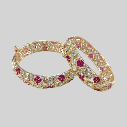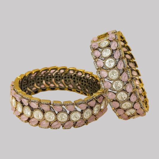 Antique Gold-Plated Kundan Bangles with Pink Stone & Polki Work