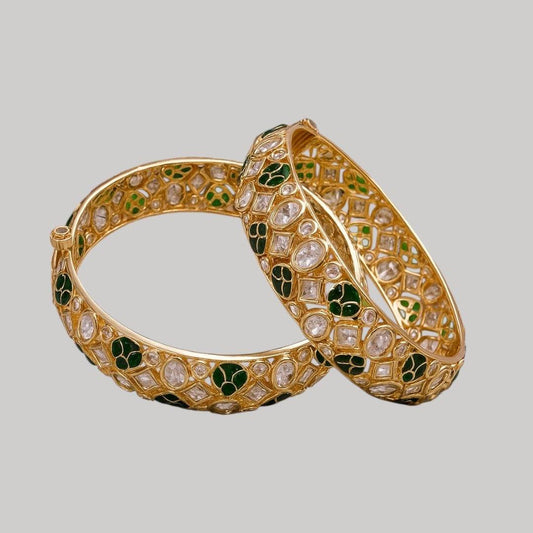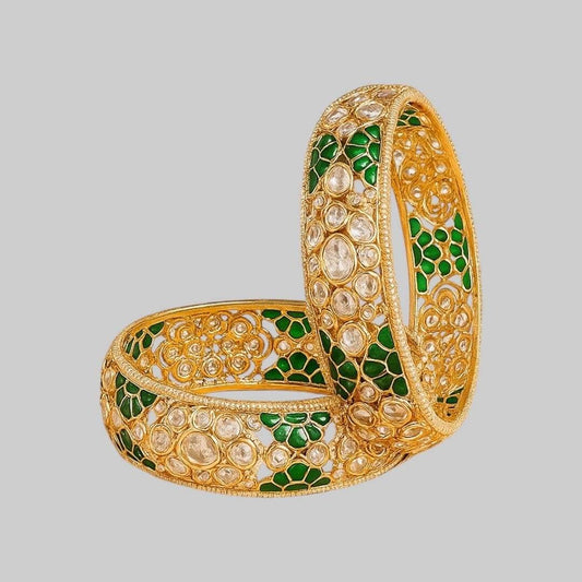 Gold-Plated Kundan Bangles with Green Enamel Work