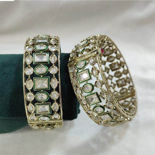 Elegant Green and White Enamel Kundan Bracelet Set with Square Shaped Stones
