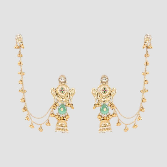 Traditional Goddess Lakshmi Gold-Plated Temple Earrings with Ear Chain & Mint Green Stone