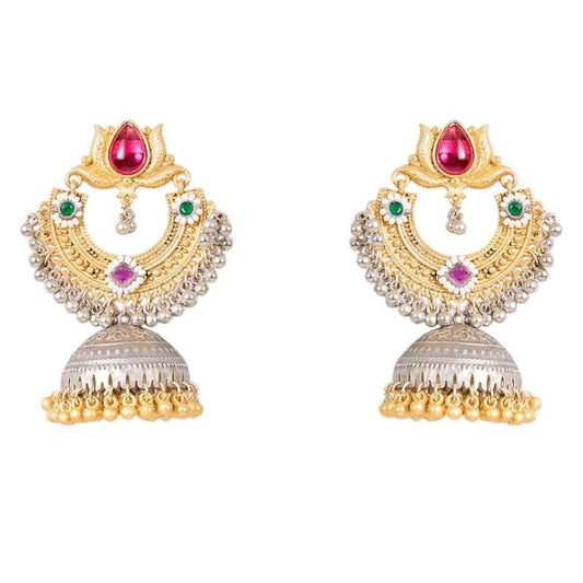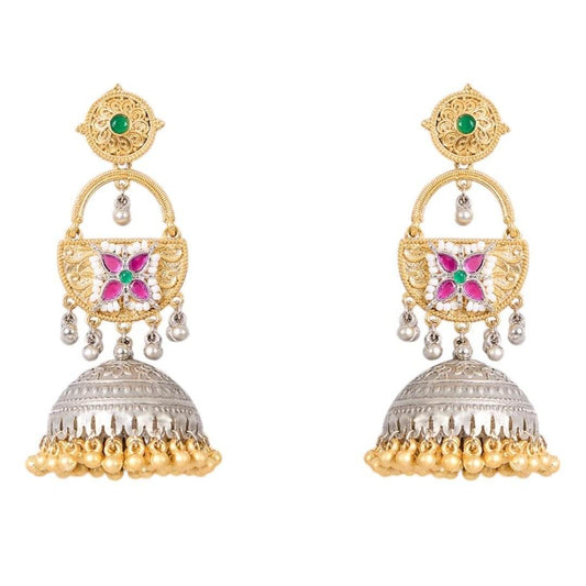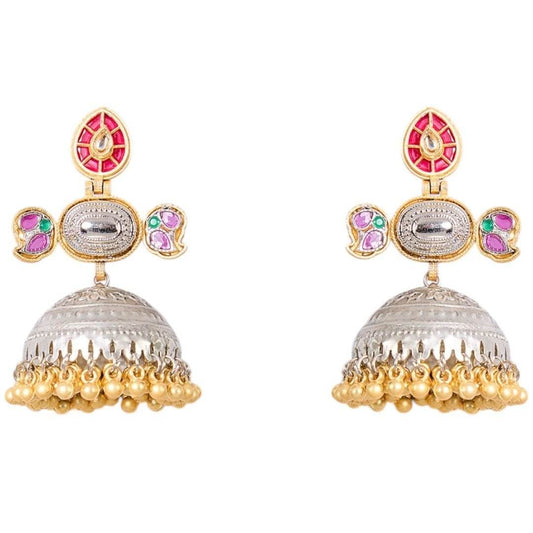 Gold & Silver-Plated Traditional Jhumka Earrings with Green & Pink Stone Detailing