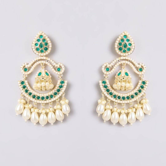 Gold-Tone Green Stone Chandbali Earrings with Pearl Drops & Mini Jhumka
