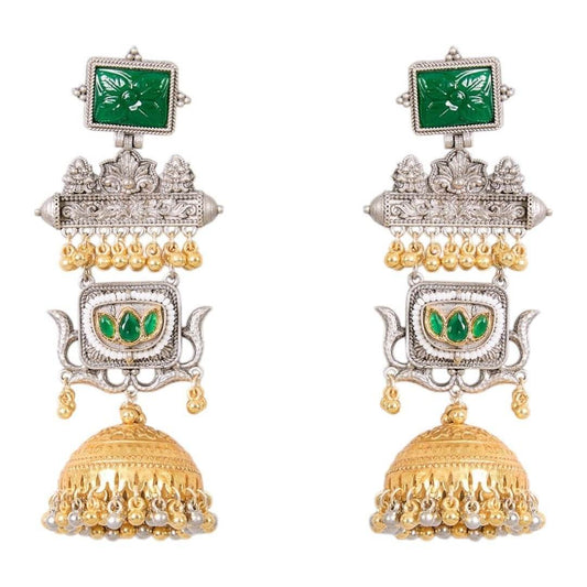 Temple-Inspired Dual Plated Long Jhumka Earrings with Green Stone & Pearl Beads