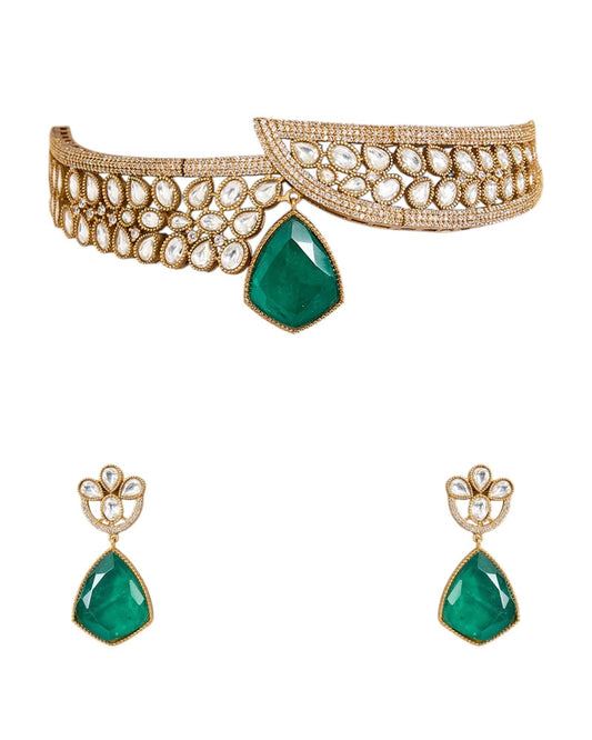 Gold Finish Kundan Polki & Emerald Stone Choker Necklace Set