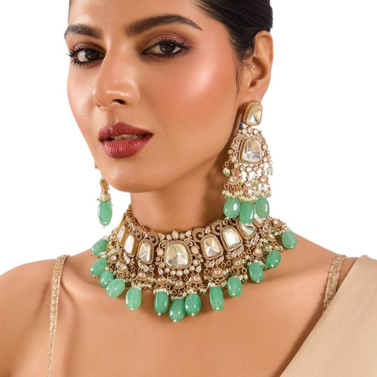Royal Green and White Kundan Choker Necklace Set with Mint Beads