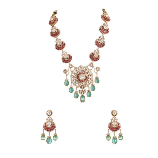 Rani Pink and Mint Green Kundan Necklace Set with Dangle Drops