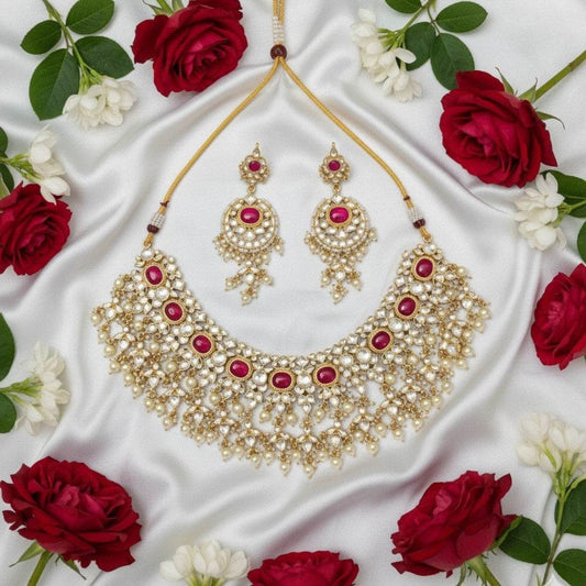 Gold-Plated Kundan Choker Necklace Set with Ruby Red Stones, Pearls & Maang Tikka