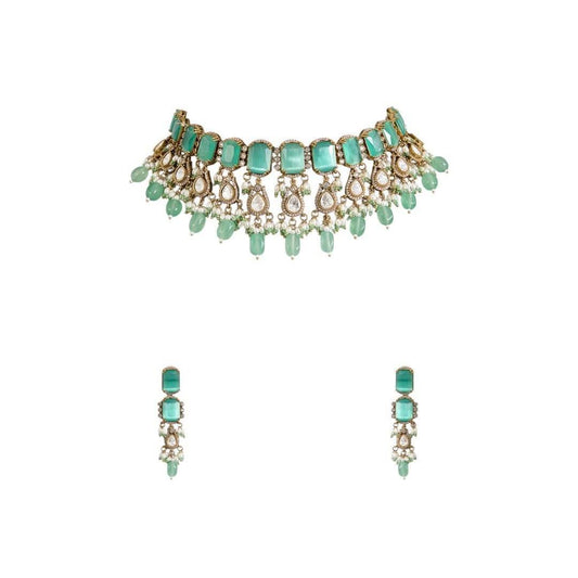 Mint Green Kundan Choker Necklace Set with Dangling Beads and Matching Earrings