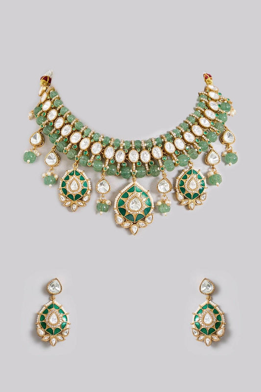 Elegant Kundan Choker Necklace Set with Green Drop Beads and Earrings for Women