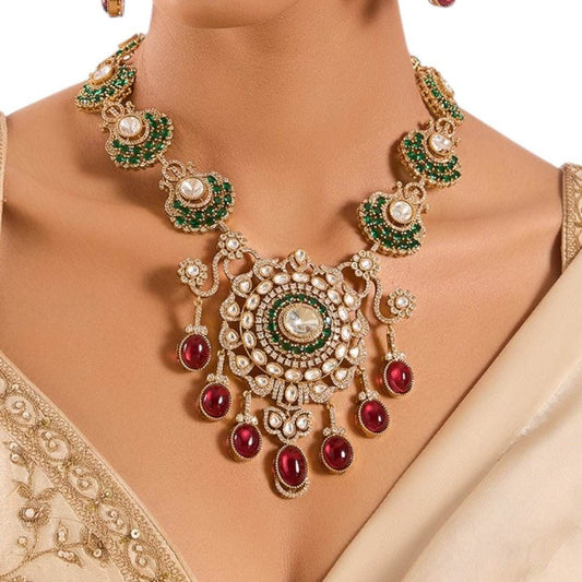 Royal Kundan Necklace Set with Ruby Red Drops and Green Accents