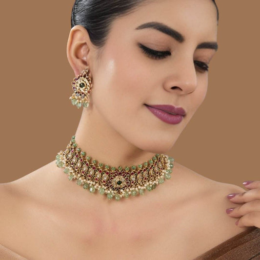 Antique Gold Floral Kundan Choker Necklace Set with Stud Earrings