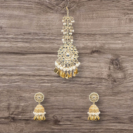 Gold-Plated Kundan Jhumka Earrings with Maang Tikka Set