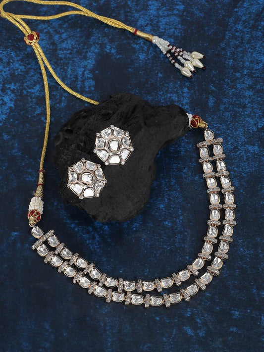Gold Finish Kundan Polki & Pearl Layered Chain Necklace Set