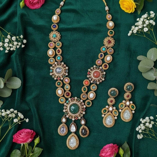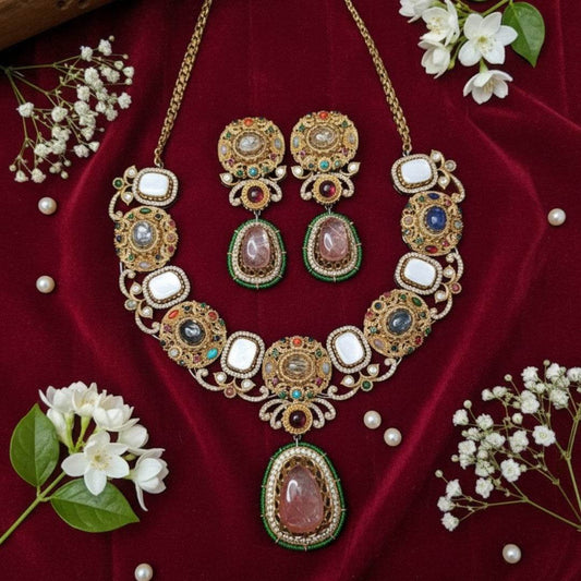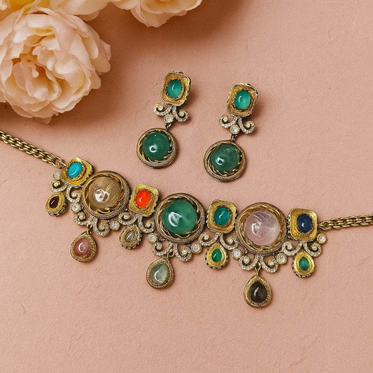 Multicolor Gemstone Statement Necklace Set with Earrings