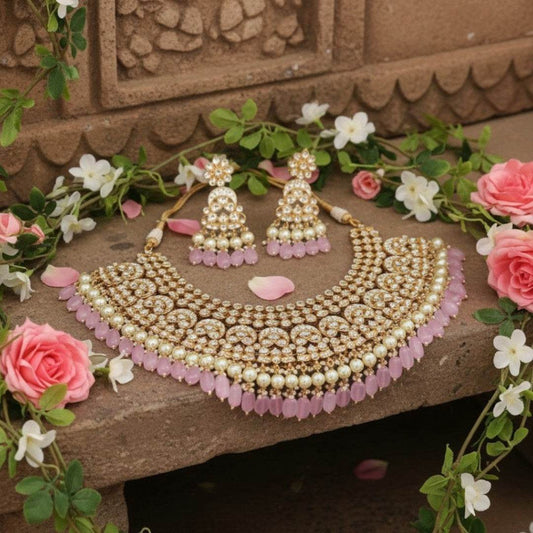 Kundan Pearl Bridal Necklace Set with Pink Beads & Maang Tikka