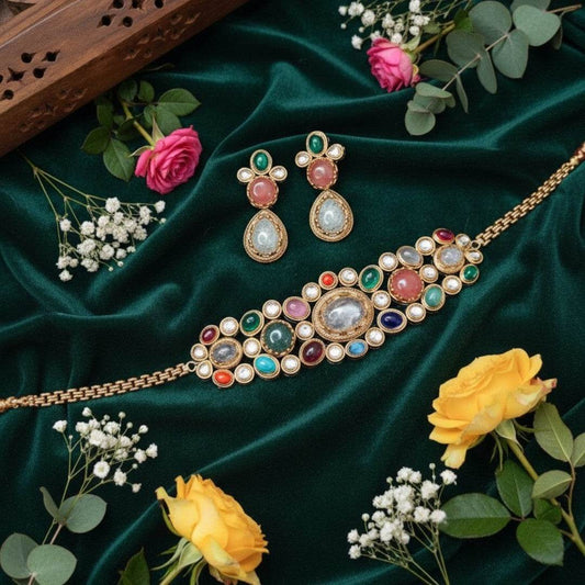 Luxury Kundan Choker Necklace Set with Grey Beads & Statement Earrings
