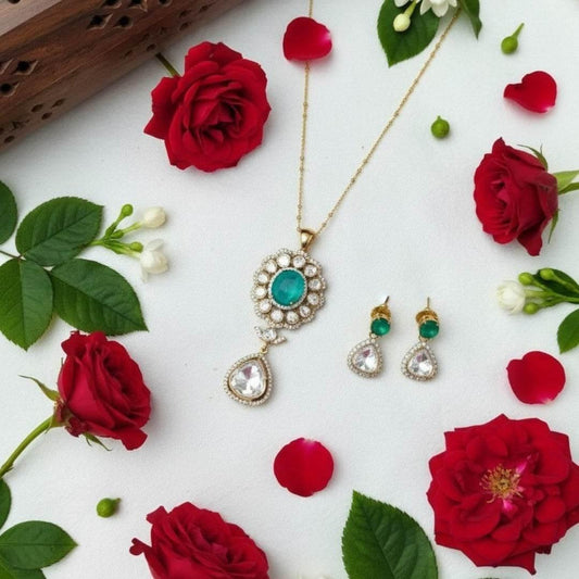 Elegant Emerald Green Stone Necklace Set with Earrings for Women