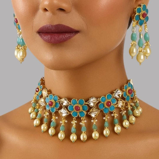 Floral Kundan Choker Necklace Set with Earrings for Women