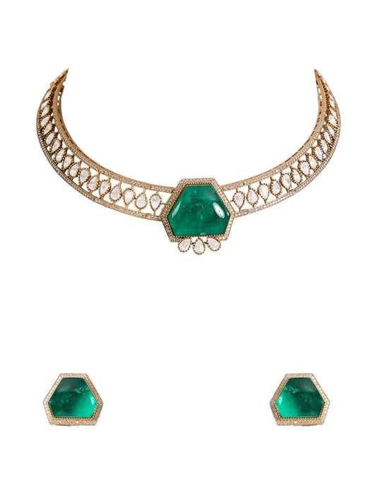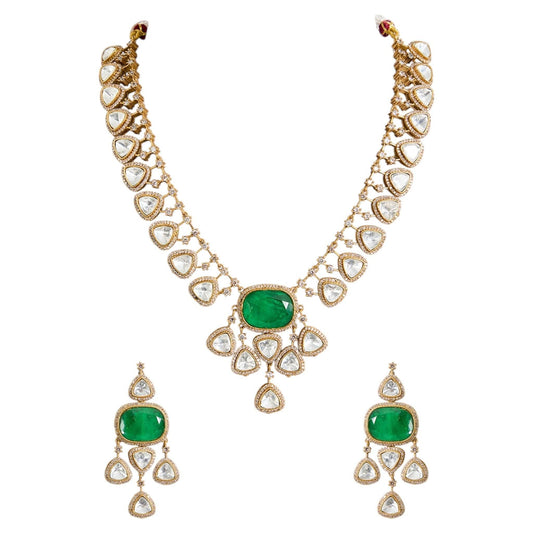 Gold Finish Kundan Polki & Emerald Stone Choker Necklace Set
