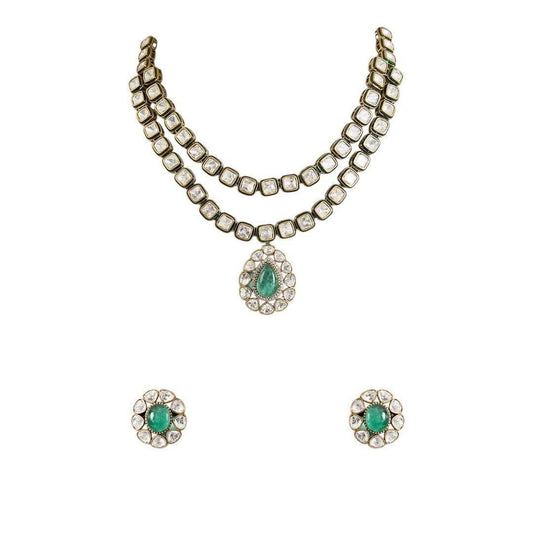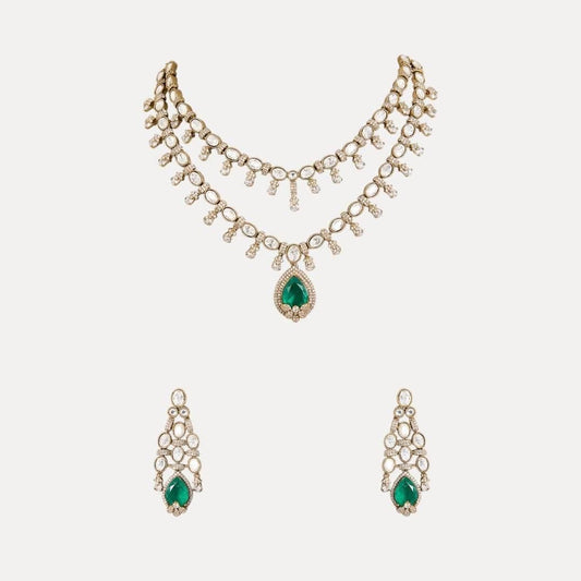 Exquisite Double-Layer Kundan Necklace Set with Emerald Pendant