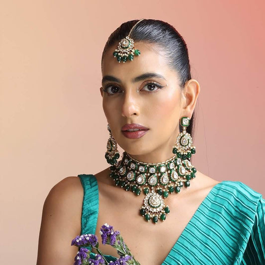 Stunning Emerald Drop Kundan Choker Set with Maangtikka – Royal Green and Pearl Combination