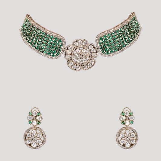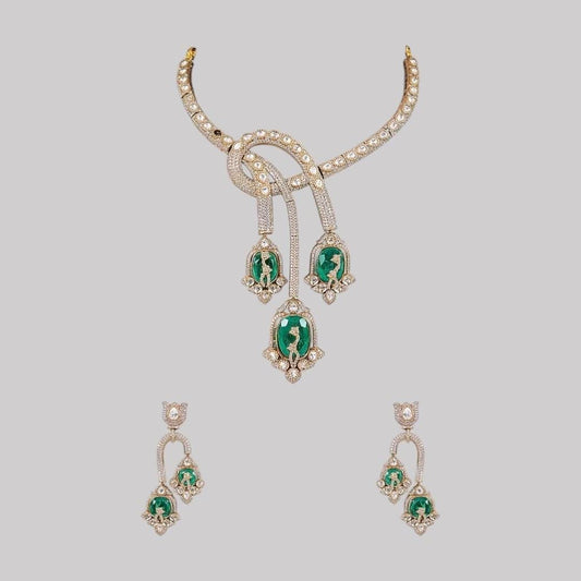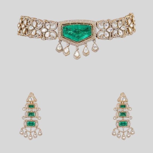 Designer Emerald Green Enamel & CZ Statement Choker Necklace Set with Long Dangler Earrings