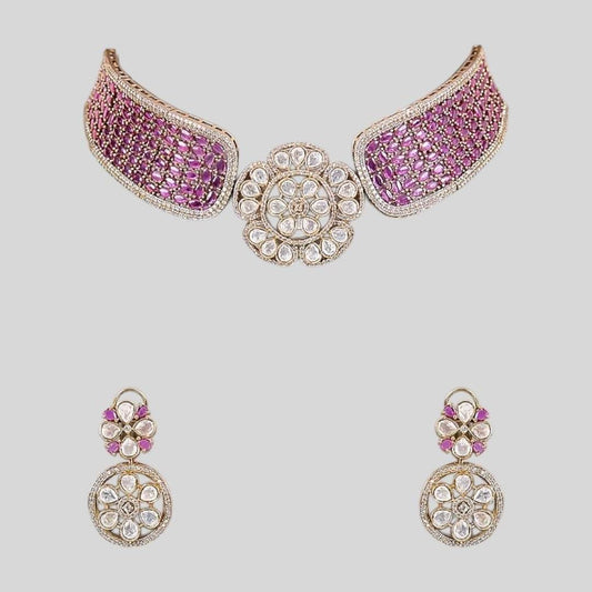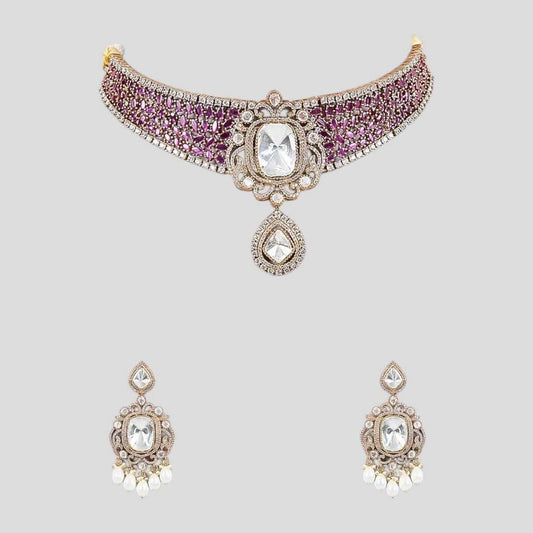 Royal Pink CZ Choker Necklace Set with Kundan-Style Earrings & Pearl Drops for Women