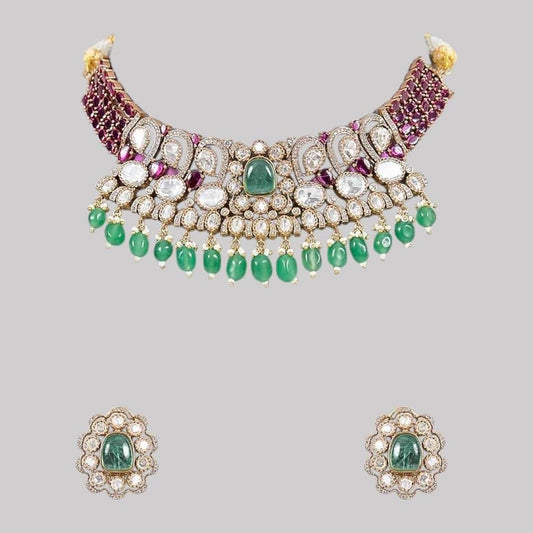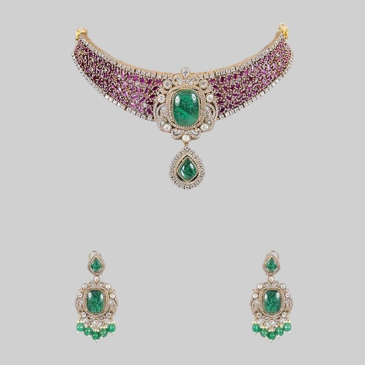 Gold-Plated Ruby Green Stone Choker Necklace Set with Drop Earrings
