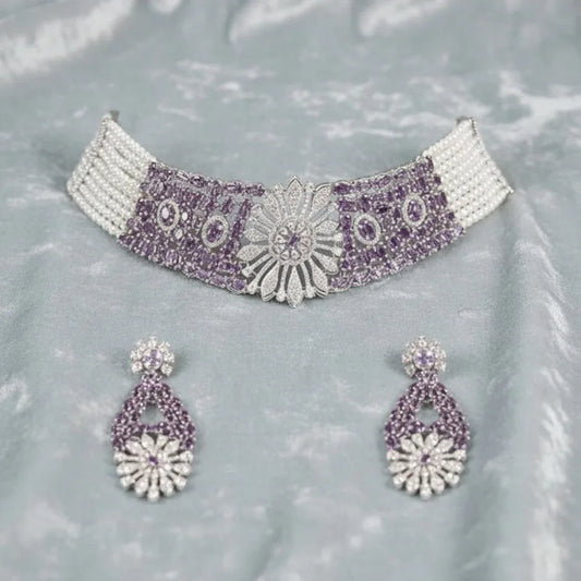 Elegant Purple Stone & Pearl Choker Necklace Set with Floral Design Earrings for Women