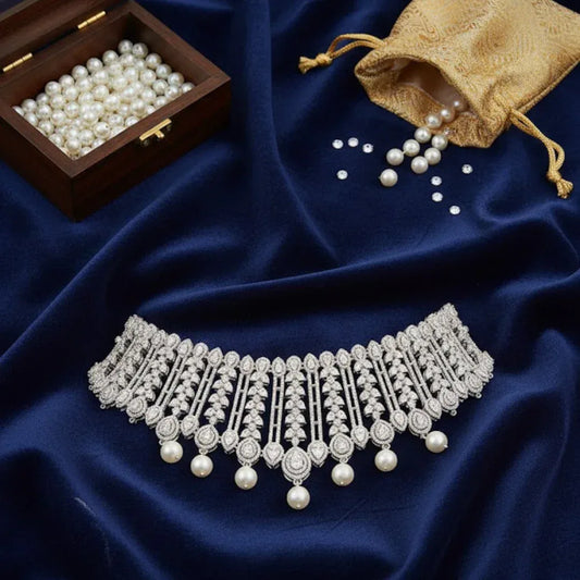Elegant Silver-Plated Bridal Choker Necklace with Pearls & CZ Stones for Women