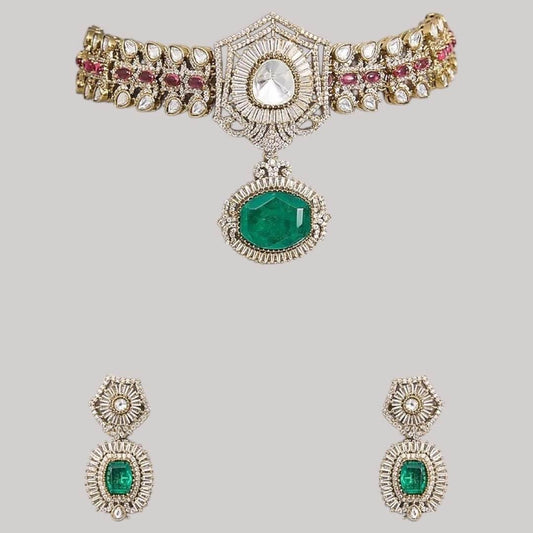Gold-Plated Green Stone & CZ Diamond Look Choker Necklace Set with Earrings for Women