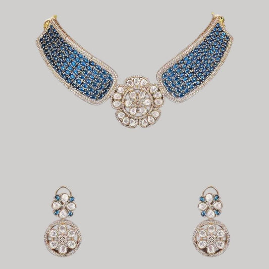 Gold-Plated Blue Stone Encrusted Choker Necklace Set with Floral Earrings