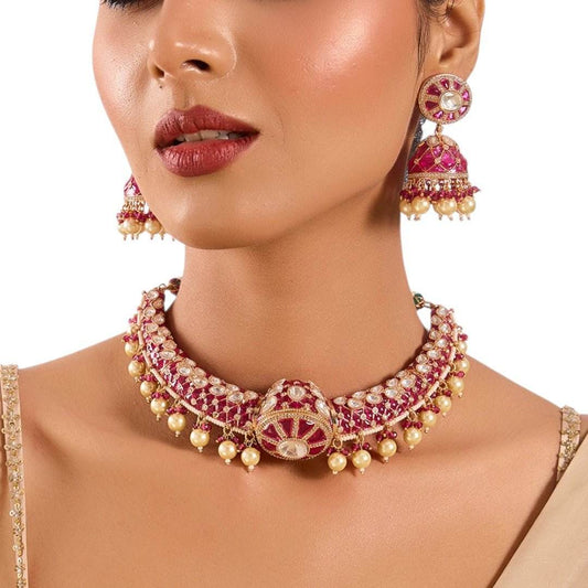 Gold-Plated Kundan Choker Necklace with Matching Earrings