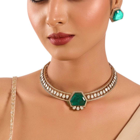 Sophisticated Emerald Green Hexagon Stone Choker Necklace with Teardrop CZ Accents