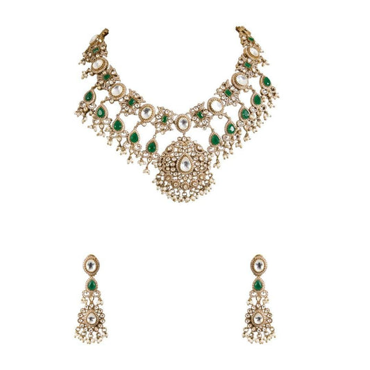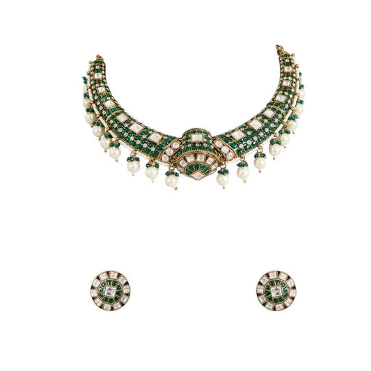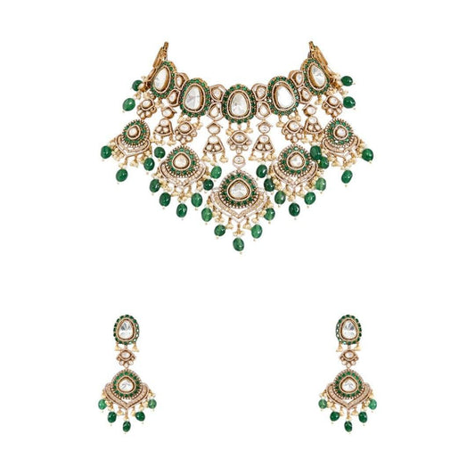 Regal Kundan and Emerald Green Beaded Choker Necklace Set