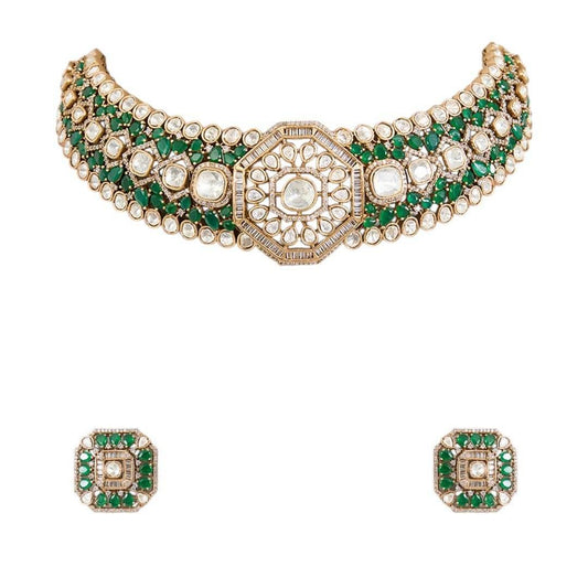 Royal Emerald Kundan Choker Necklace Set with Designer Stud Earrings