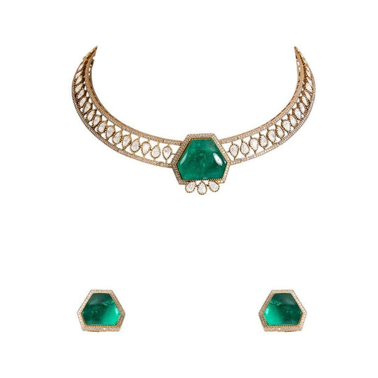 Sophisticated Emerald Green Hexagon Stone Choker Necklace with Teardrop CZ Accents