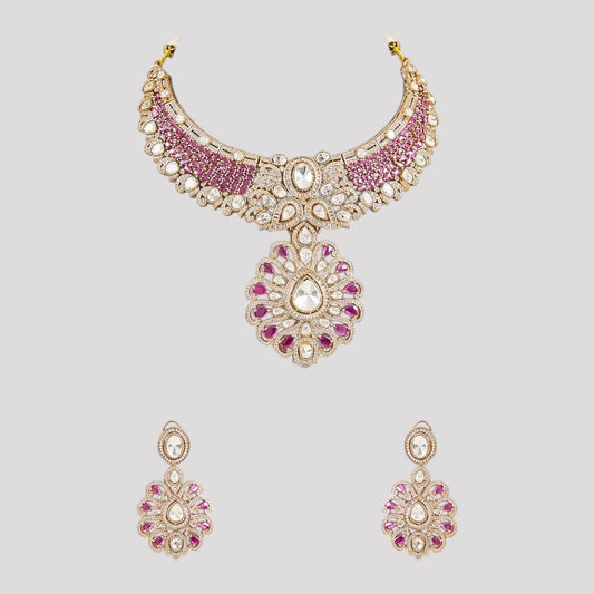 Exquisite Pink & White Stone Studded Necklace Set with Matching Earrings