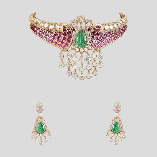 Gold-Plated Ruby & Emerald Choker Necklace Set with Kundan Stones for Women