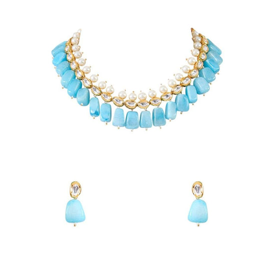 Modern Blue Stone and Pearl Layered Necklace Set with Matching Drop Earrings