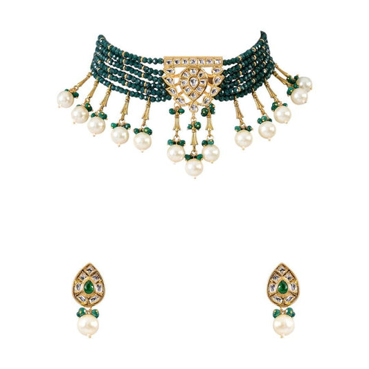 Regal Emerald Green Beaded Choker Necklace Set with Pearl Drops and Kundan Centerpiece